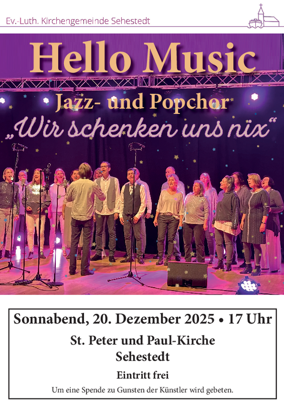 Mit nicht ganz ernst gemeinten Betrachtungen zur Vorweihnachtszeit und natürlich jeder Menge Weihnachtslieder will der Kronshagener Jazz- und Popchor „Hello Music“ sein Publikum am Sonnabend, den 20. Dezember um 17 Uhr in der St.-Peter-und-Paul-Kirche in Sehestedt auf die bevorstehenden Festtage einstimmen.