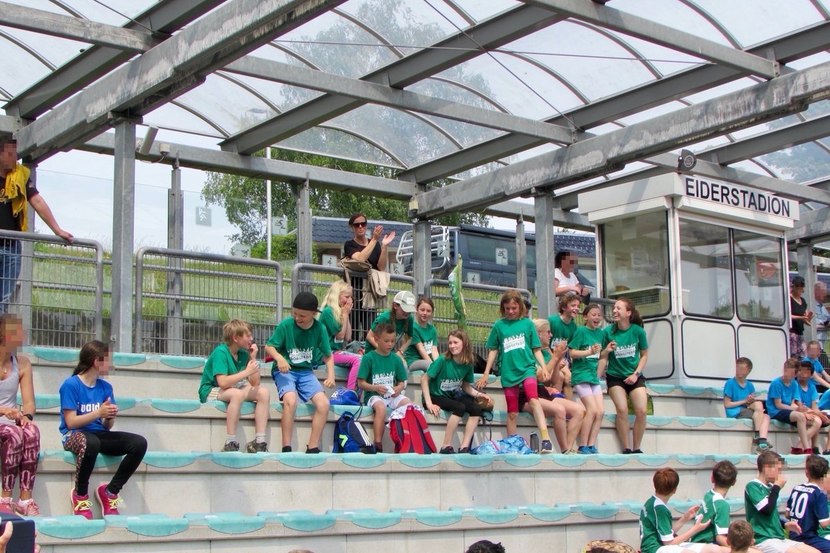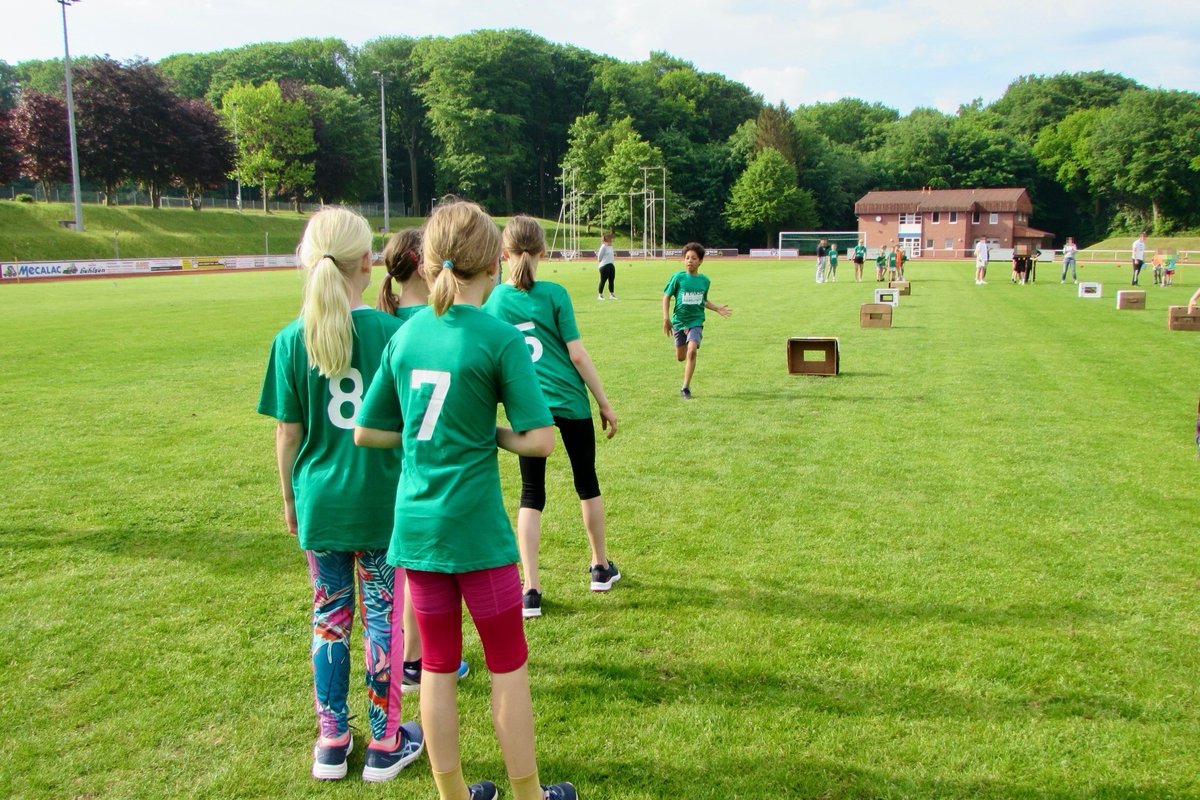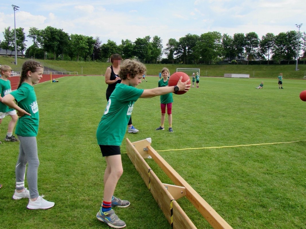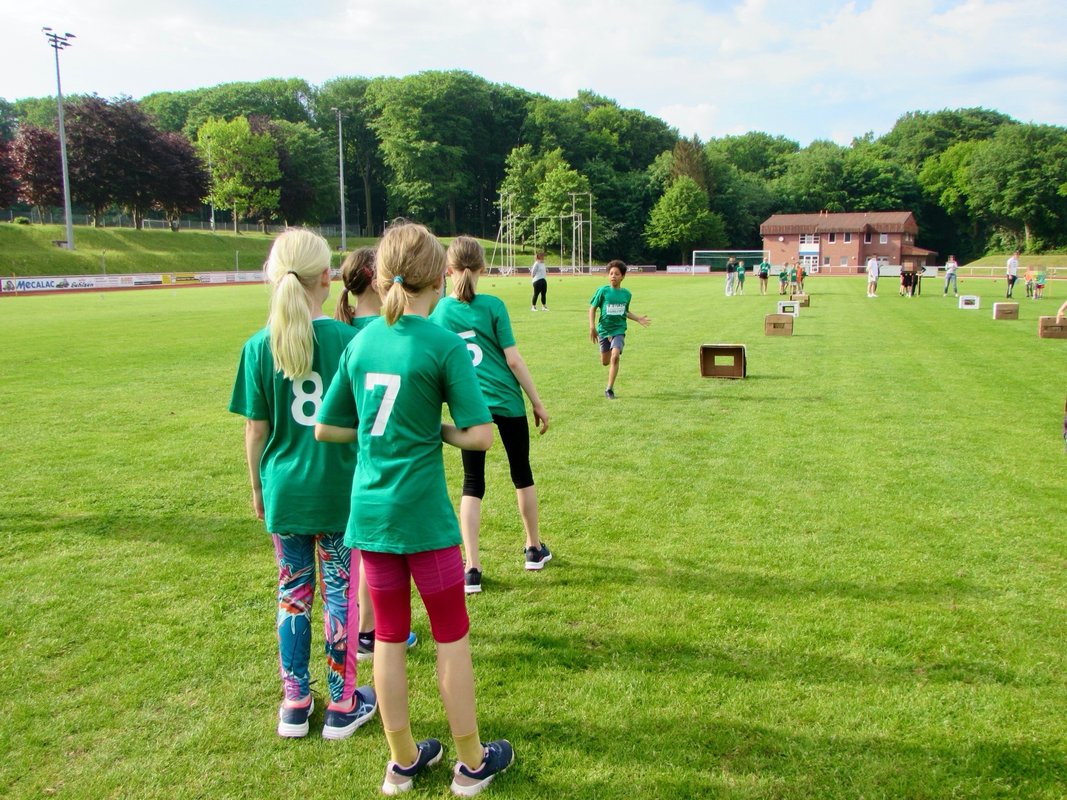 Für einige Kinder aus der dritten und vierten Klasse ging es heute besonders sportlich zu: Sie durften als Team unserer Schule bei den Leichtathletik-Kreismeisterschaften in Büdelsdorf an den Start gehen! Nach der kurzen Anreise im Bus wurden die Augen beim Anblick des tollen Stadions ganz groß. Voller Stolz wurden die schuleigenen Trikots angezogen und dann ging es auch schon los: Mit Schwung wurden beim Hürdenlauf die Bananenkartons überflogen, der Schlagball Richtung Himmel geschickt, der Medizinball über die Langbank gestoßen und neue Rekorde an der Weitsprunganlage aufgestellt. Zu guter Letzt ging es an den Ausdauerlauf – bei den schwül-warmen Temperaturen eine besondere Herausforderung. Aber auch das meisterte die Truppe hervorragend!