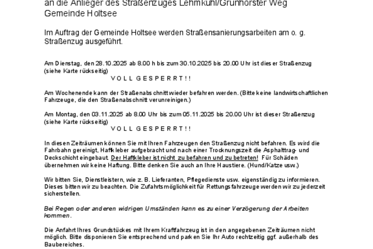 Sperrung des Straßenzugs Lehmkuhl/Grünhorster Weg vom 28. bis 30. Oktober und vom 3. bis 5. November