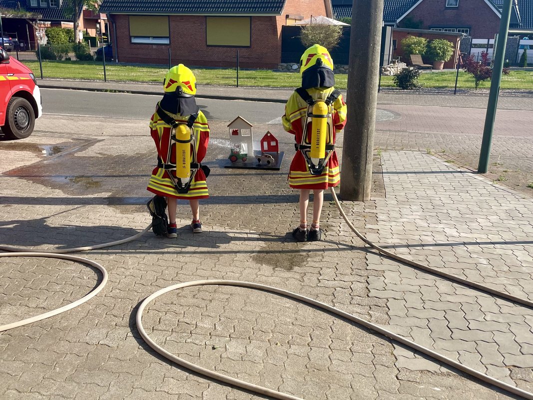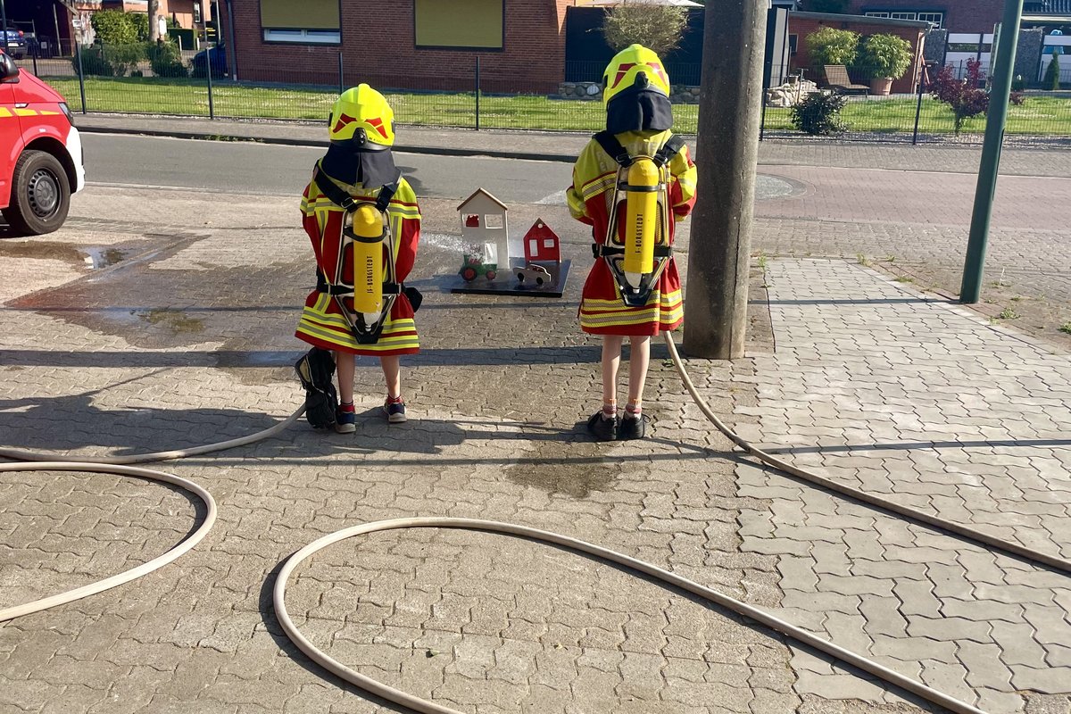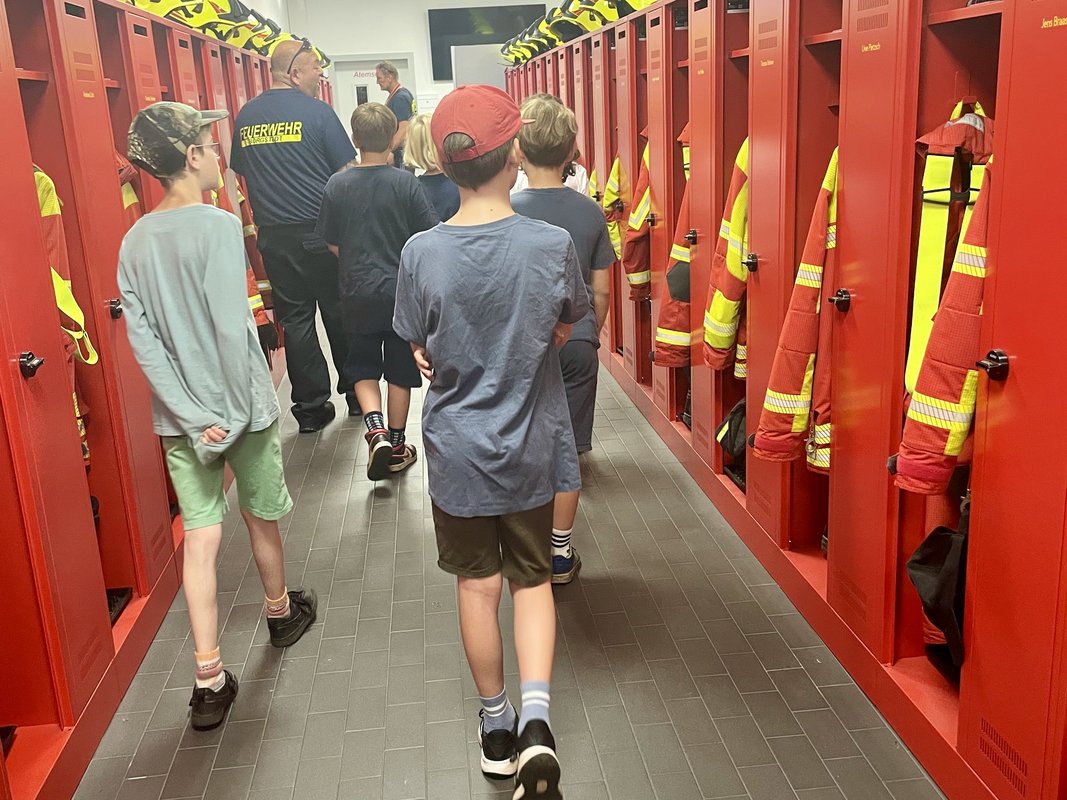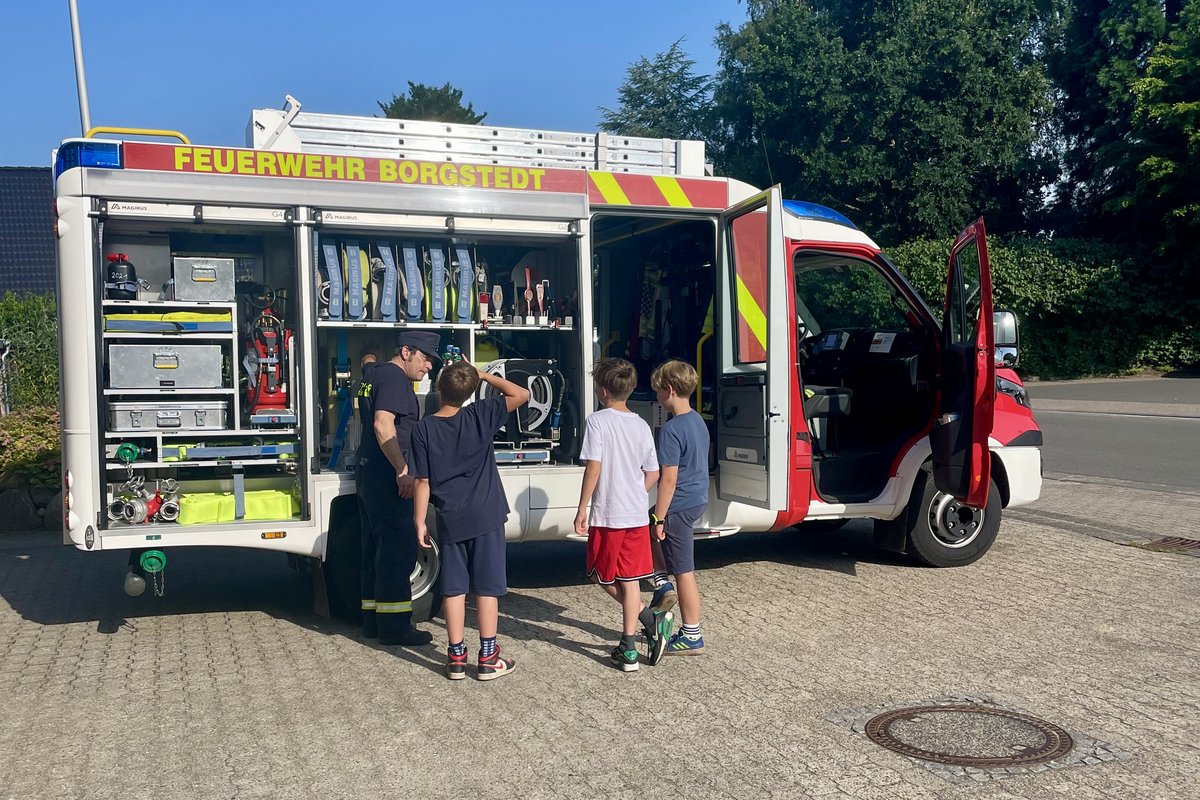 Die Klasse wurde in zwei Gruppen aufgeteilt: Während eine Gruppe zur Borgstedter Feuerwehr spazierte, blieb die andere in der Schule und absolvierte einen Kurs in Knotenkunde. Nach der Hälfte des Vormittags wurde getauscht, sodass alle Kinder beides erleben konnten.