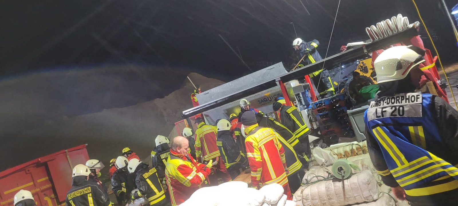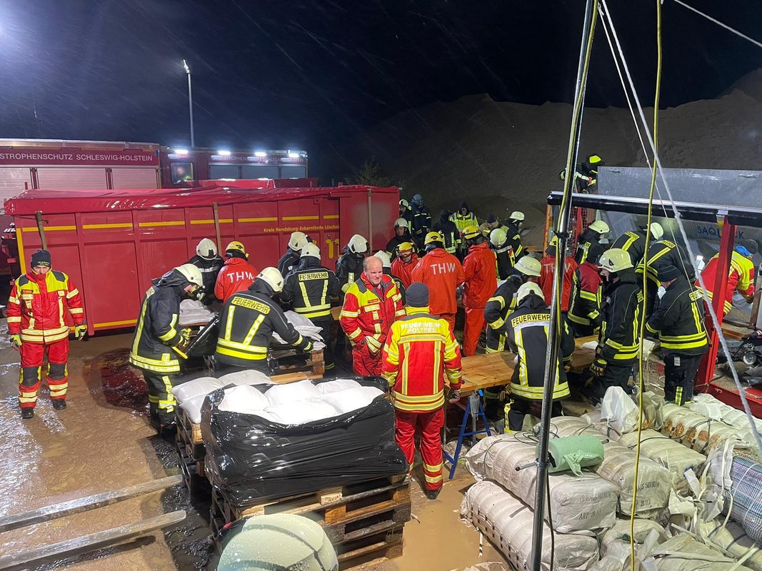 Nach einem Voralarm am Donnerstag um 19:30 Uhr bekamen wir am Freitag, den 20. Oktober um 11:50 Uhr einen Alarm für die 2. Feuerwehr-Landesbereitschaft. Über Whatsapp wurde eine Gruppe aus Leon Becker, Julian Haß, Kai-Uwe Haß, Sönke Koberg, Mirko Krabbenhöft, Pascal Ludat, Boris Neuhoff, Achim Seidel und Martin Thormählen zusammengestellt, die das LF KatS besetzt hat und zum Treffpunkt am Schulzentrum Süd in Eckernförde gefahren ist. Von dort wurden die Kameraden nach Damp verlegt, wo gemeinsam mit dem LF KatS der Feuerwehr Karby-Dörphof der Deich gesichert wurde. In den Abendstunden wurde Katastrophenalarm für den Bereich Eckernförde / Amt Schlei-Ostsee ausgelöst, sodass weitere Einheiten aus dem Kreisgebiet zur Verstärkung anrückten. Unsere Einheit wurde in Damp abgelöst und ab 21:30 Uhr unterstützten sie in der Kiesgrube in Gammelby beim Befüllen von Sandsäcken. Um 23:30 Uhr wurden sie aus dem Einsatz entlassen.