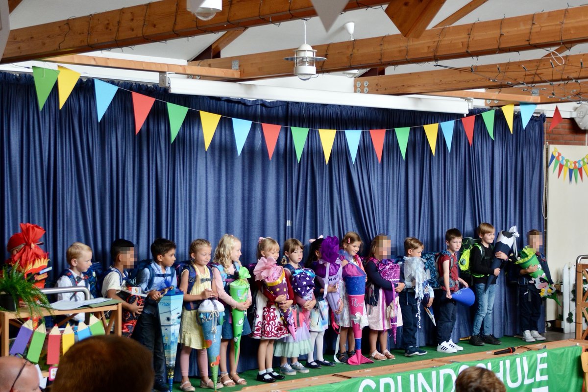 Anschließend ging die Feierei in der Aula in die zweite Runde. Unter den stolzen Augen der Eltern sowie zahlreicher weiterer Gäste saßen sie mit ihren Schulranzen und gut gefüllten Schultüten - als hätten sie nie etwas anderes gemacht - gemeinsam auf den Bänken und verfolgten gebannt die Auftritte des Schulchors und des Musikprojekts. Danach ging es endlich an den wirklich wichtigen Ort: den eigenen Klassenraum! Der aufregende Vormittag endete für die waschechten Schulkinder im Blitzlichtgewitter, wo das allererste Klassenfoto geschossen wurde.