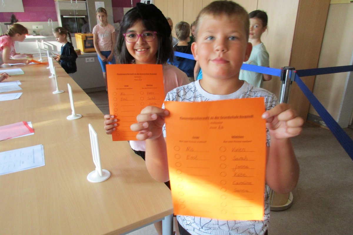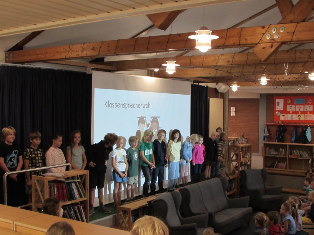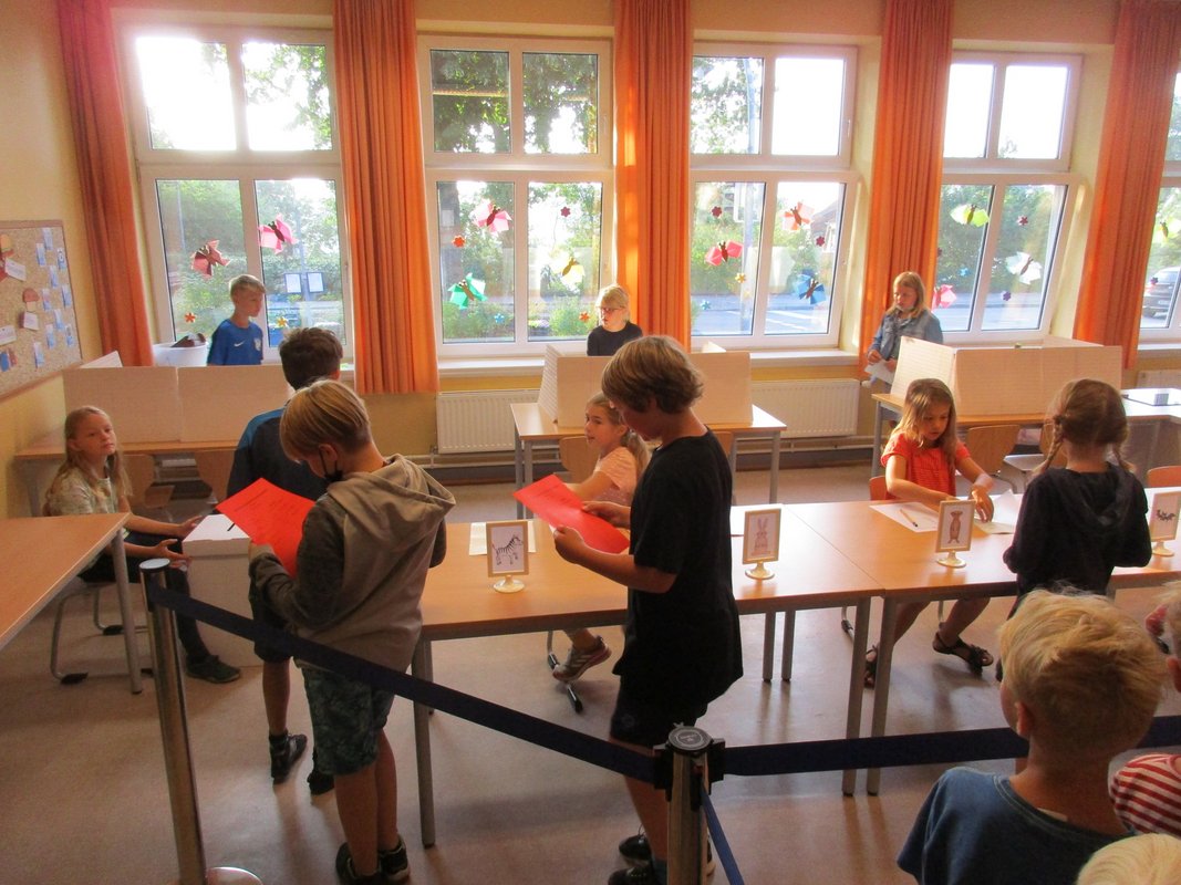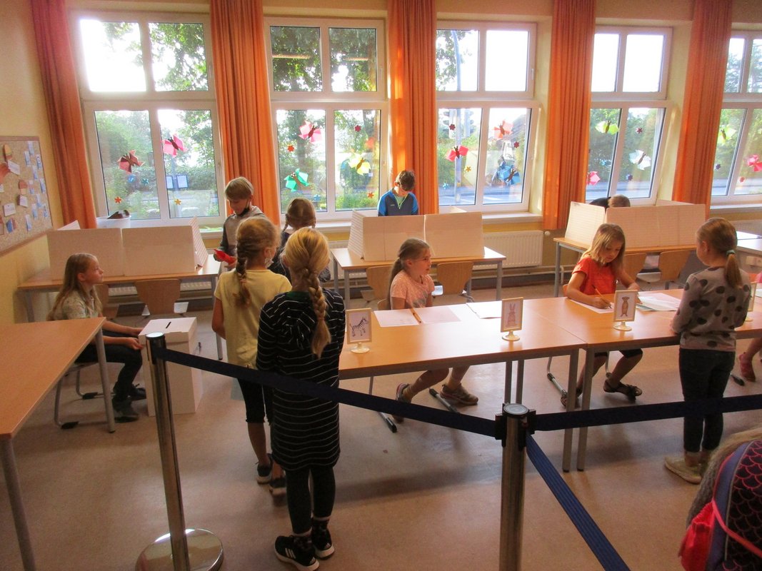Zu Beginn des neuen Schuljahres ist nicht nur die Einschulung ein großes Highlight, auch die Wahl der Klassenvertretungen wird mit Spannung erwartet. Von der 2. bis zur 4. Klasse dürfen sich Mädchen und Jungen zur Wahl stellen. Dazu gehört natürlich auch ein fairer und wertschätzender Wahlkampf. In kleinen Reden durfte sich jede Kandidatin und jeder Kandidat den Mitschülern vorstellen und verdeutlichen, warum man für das Amt der Klassensprecherin oder des Klassensprechers geeignet ist. Am Freitag war es dann so weit. Alle Kinder durften im Wahlbüro, der Schulküche, wählen und zwar wie die Großen. Es gab Wahlhelferinnen aus Klasse 4, die die Wahl betreuten, dazu Wahlkabinen, Wahlzettel, eine Wahlurne und natürlich mussten bei uns die Wählerinnen und Wähler ab und zu auch etwas anstehen. Auf der ersten Sitzung des Kinderparlaments in diesem Schuljahr wurden die gewählten Klassenvertretungen dann bekannt geben. Es waren sehr knappe Ergebnisse! Wir gratulieren allen Gewählten zu ihrem Amt und bedanken uns bei allen Kindern, die den Mut hatten, sich zur Wahl zu stellen und eine kleine Rede zu halten.