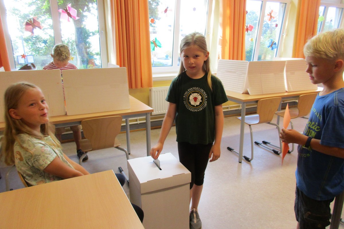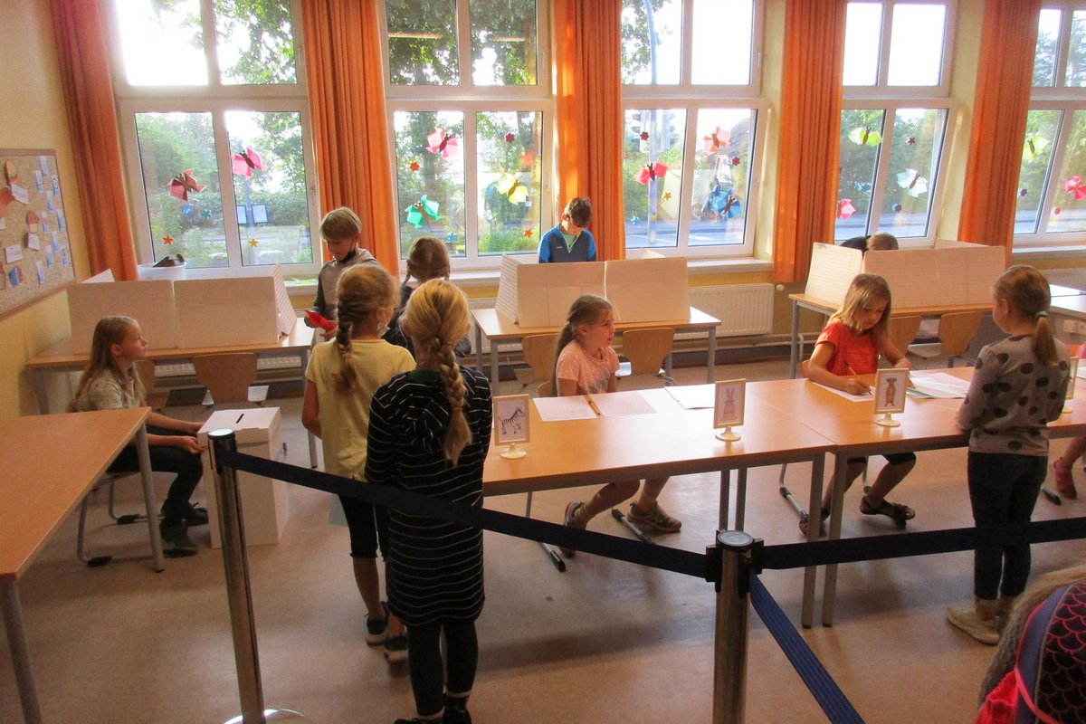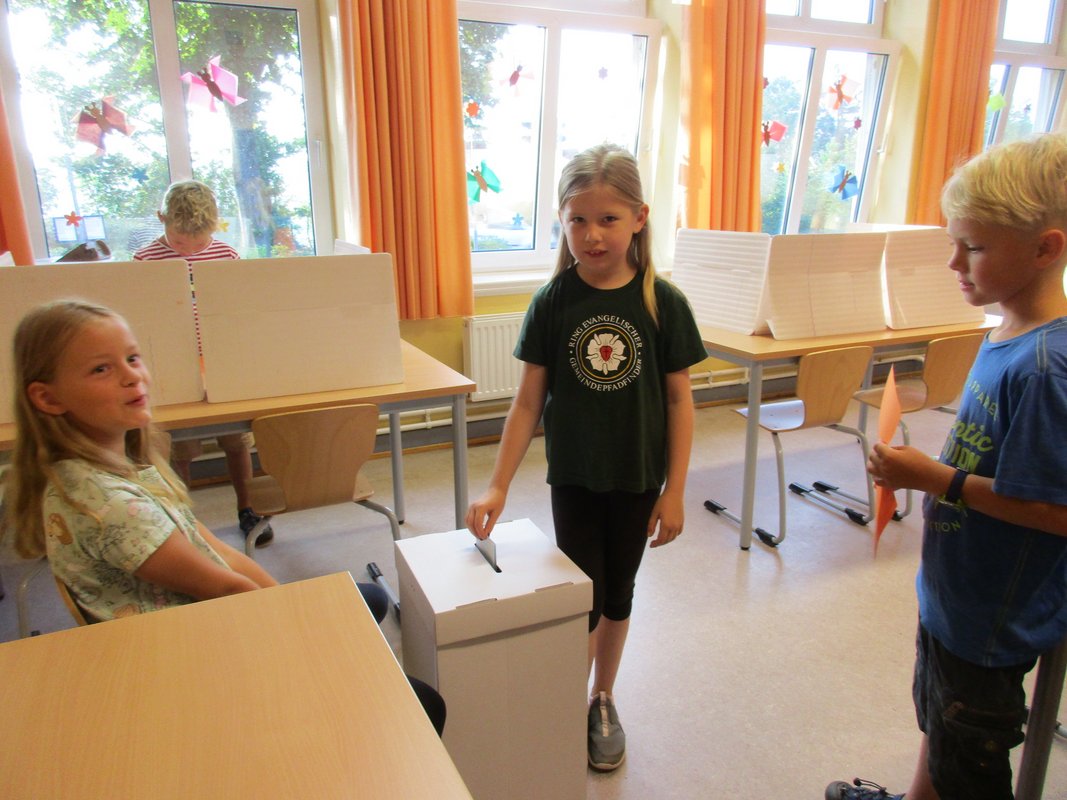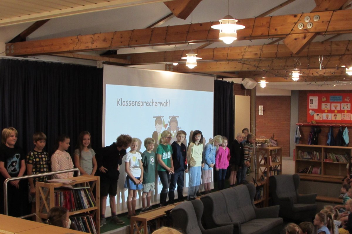 Zu Beginn des neuen Schuljahres ist nicht nur die Einschulung ein großes Highlight, auch die Wahl der Klassenvertretungen wird mit Spannung erwartet. Von der 2. bis zur 4. Klasse dürfen sich Mädchen und Jungen zur Wahl stellen. Dazu gehört natürlich auch ein fairer und wertschätzender Wahlkampf. In kleinen Reden durfte sich jede Kandidatin und jeder Kandidat den Mitschülern vorstellen und verdeutlichen, warum man für das Amt der Klassensprecherin oder des Klassensprechers geeignet ist. Am Freitag war es dann so weit. Alle Kinder durften im Wahlbüro, der Schulküche, wählen und zwar wie die Großen. Es gab Wahlhelferinnen aus Klasse 4, die die Wahl betreuten, dazu Wahlkabinen, Wahlzettel, eine Wahlurne und natürlich mussten bei uns die Wählerinnen und Wähler ab und zu auch etwas anstehen. Auf der ersten Sitzung des Kinderparlaments in diesem Schuljahr wurden die gewählten Klassenvertretungen dann bekannt geben. Es waren sehr knappe Ergebnisse! Wir gratulieren allen Gewählten zu ihrem Amt und bedanken uns bei allen Kindern, die den Mut hatten, sich zur Wahl zu stellen und eine kleine Rede zu halten.