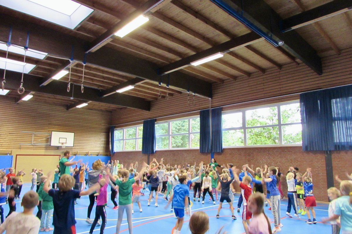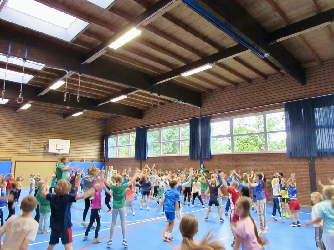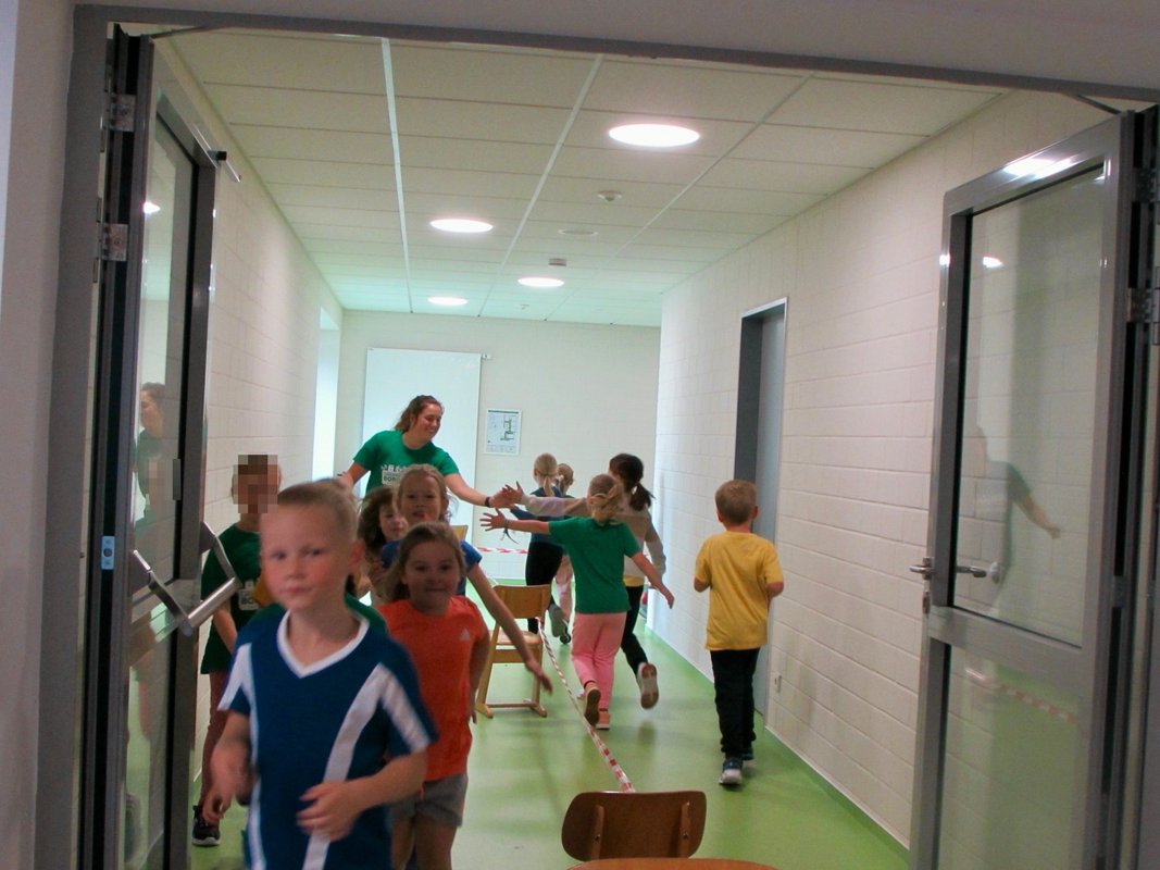 Gleich zu Wochenbeginn ging es mal wieder sehr sportlich bei uns zu: Wir haben am Aktionstag „Laufwunder“ der AOK teilgenommen. Ausgestattet mit unseren Laufwunder-Armbändern kamen wir ganz schön ins Schwitzen, als es galt, 60 Minuten durchzulaufen! Witterungsbedingt konnten wir zwar nicht wie geplant auf dem Schulgelände unsere Runden drehen, allerdings haben wir gezeigt, dass wir auch drinnen gar kein Problem damit haben, neue Rekorde aufzustellen. Zu Beginn gingen die Kinder eine Wette mit Herrn Jaekel ein: Er wettete, dass er mehr Liegestütze machen könne, als es Kinder schaffen würden, die 60 Minuten zu knacken. Als Wetteinsatz wurde ein Eis für alle Kinder eingeloggt. Nach der gemeinsamen Erwärmung durch die Erdmäuse in der Sporthalle ging es los: Klasse 1 und 2 machten das Schulgebäude unsicher (und durften dort ausnahmsweise laufen statt gehen) und Klasse 3 und 4 brachten den neuen Hallenboden ordentlich zum Vibrieren. Für kleine Energiekicks zwischendurch sorgten leckere Bananen, die der Edeka aus Büdelsdorf gesponsert hatte. Mit motivierender Musik sowie vielen anfeuernden und sogar mitlaufenden Eltern drehten am Ende noch 99 Kinder ihre Runden. Für die letzten zwei Minuten kamen auch die Laufenden aus dem Schulgebäude wieder in die Halle und reihten sich ein. Gemeinsam wurden die restlichen Sekunden gelaufen und der Jubel und Stolz war am Ende bei allen groß. Noch größer wurde die Freude allerdings, als Herr Jaekel seine Wette ganz knapp verlor und alle Kinder ihr verdientes Eis bekamen. Wir waren beeindruckt von allen gezeigten sportlichen und unterstützenden Leistungen - bei Groß und Klein, bei 5 und bei 60 Minuten!