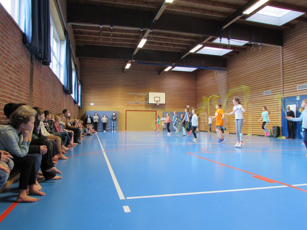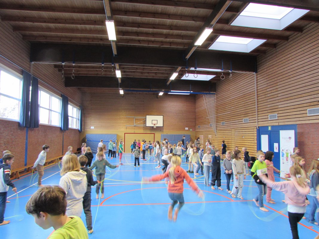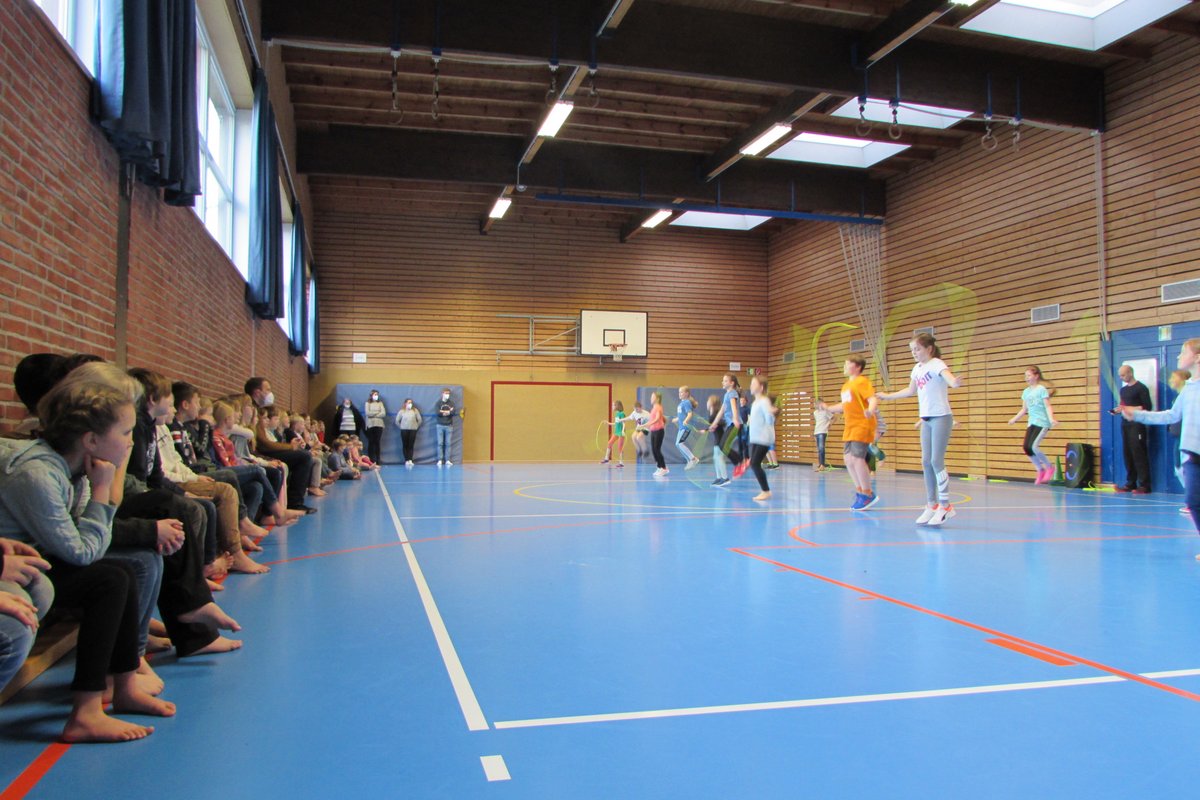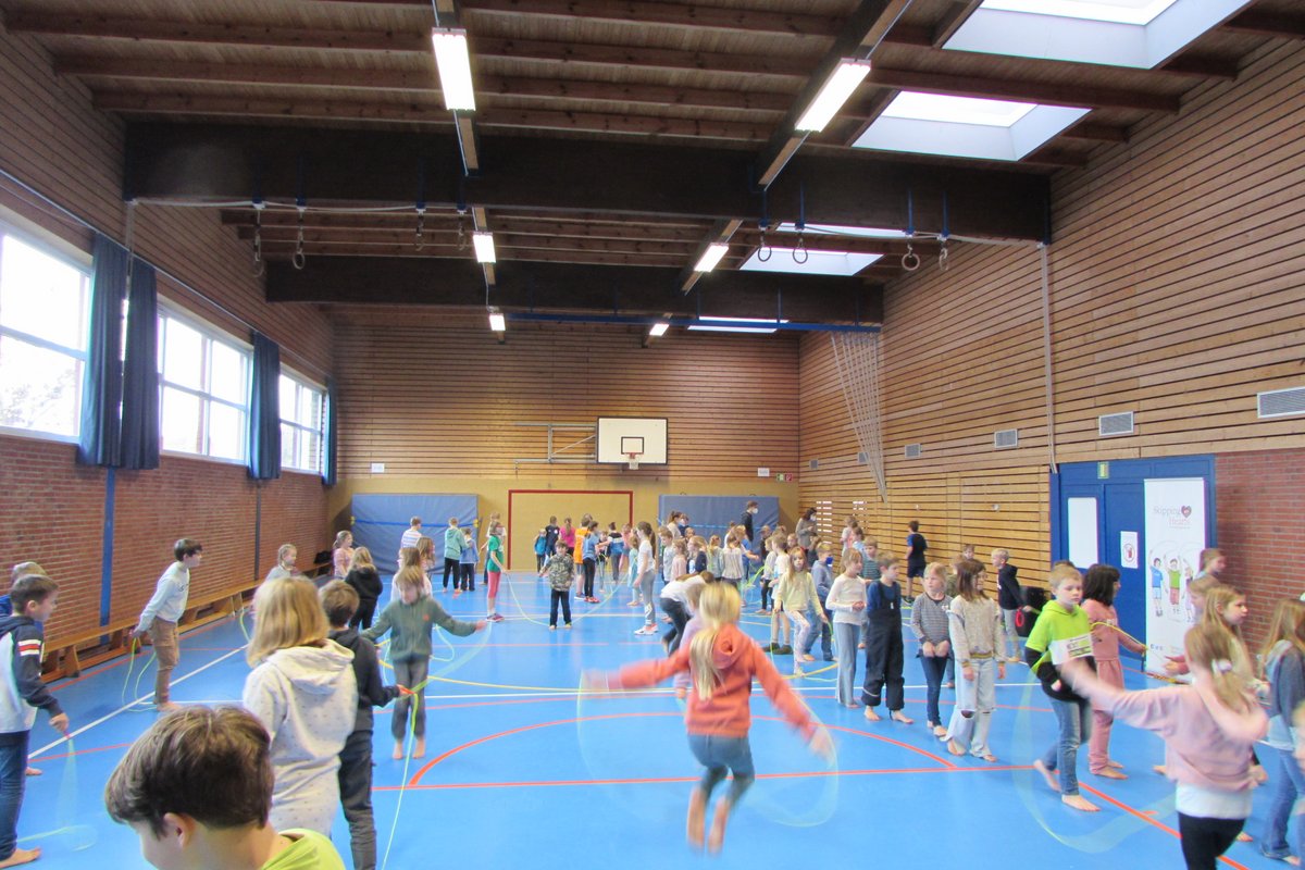 Am 1. Februar 2023 fand an der GS Borgstedt der Workshop ”Skipping Hearts – Seilspringen macht Schule“ statt. Es handelt sich dabei um ein Projekt der Deutschen Herzstiftung. Durch Spaß an der Bewegung im Grundschulalter wird ein gesunder Lebensstil angeregt. Dieser ist eine wichtige Voraussetzung, um im Alter nicht am Herzen zu erkranken. Die Schüler und Schülerinnen der Klasse 4 machten sich also auf in die Turnhalle, wo sie von Workshopleiter Ronny Steinbrück erwartet wurden. Unter dem Motto „Jeder wie er/sie kann“, wurden zunächst einfache, dann immer schwierigere Sprünge mit dem Seil eingeübt. Mit Musik und guter Laune absolvierten die Kinder schließlich den aufgebauten Parcours. Als Höhepunkt der Veranstaltung gab Klasse 4 eine Seilsprungvorstellung vor allen anderen Klassen der Schule. Im Anschluss übten alle Kinder gemeinsam und hochmotiviert das Seilspringen. In den Pausen kann man erkennen, dass nun das Seilspringfieber bei uns ausgebrochen ist.