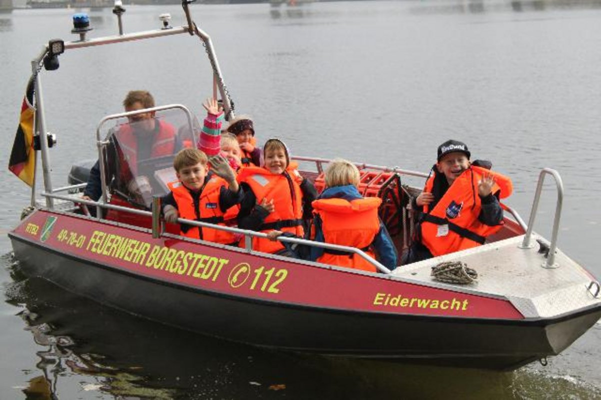 Unsere Erstklässler bekamen Besuch von einem Polizisten. Sie durften seine Ausrüstung bestaunen, lernten etwas über gute Sichtbarkeit und übten das sichere Überqueren der Straße. Die Zweitklässler erfuhren von der Feuerwehr viel über den richtigen Umgang mit Feuer. Sie durften außerdem Tätigkeiten der Feuerwehr erproben, einen Einsatzwagen ansehen und mit dem Feuerwehrboot eine Runde auf dem Audorfer See drehen. Die Drittklässler wurden von zwei Mitarbeiterinnen der Johanniter Unfallhilfe in erster Hilfe geschult und die Viertklässler lernten, wie man soziale Medien sicher nutzt.