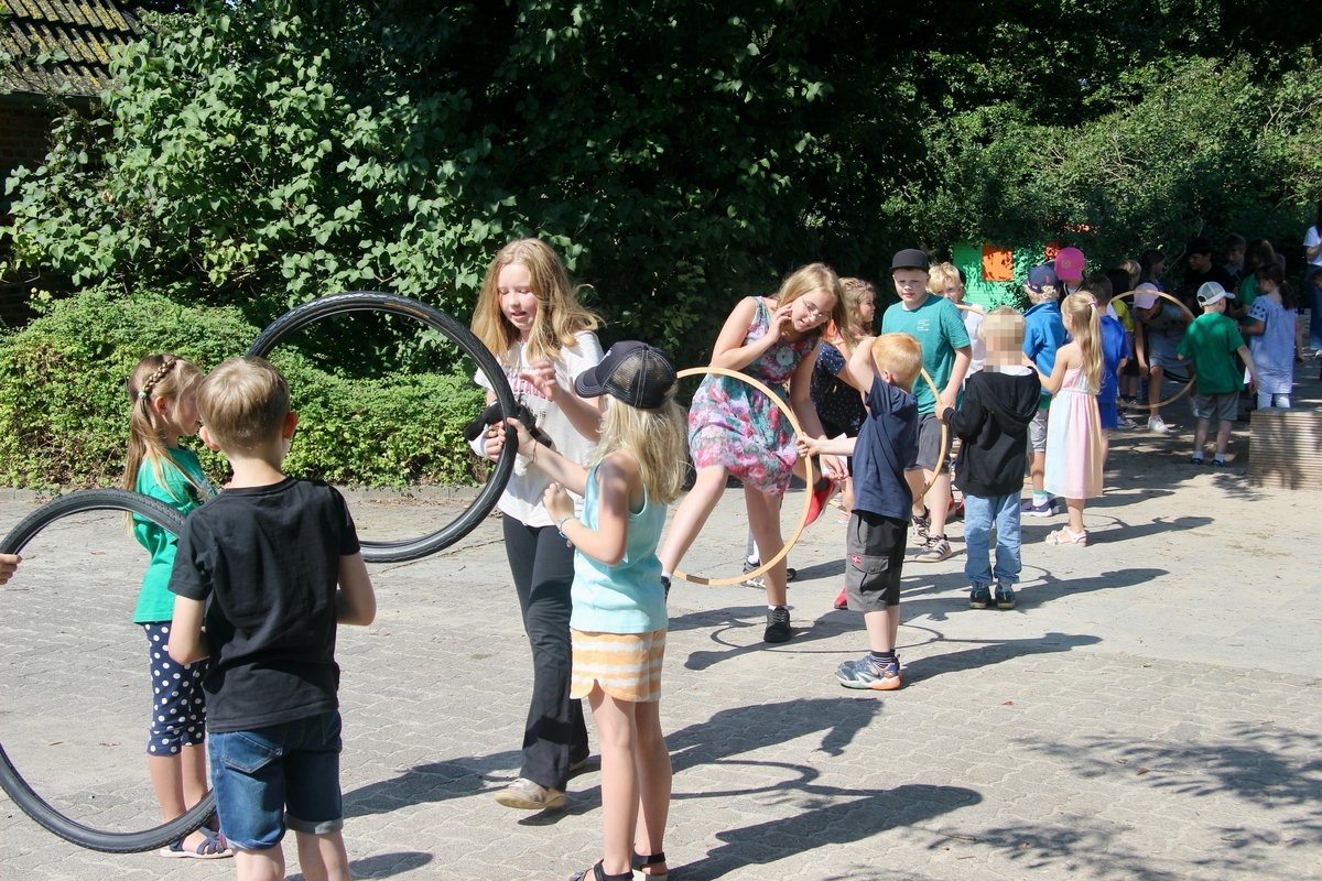 Dieses Team wurde nun von der gesamten Schulgemeinschaft verabschiedet. Hierfür durften die Großen bei strahlendem Sonnenschein durch das Reifenspalier der anderen Kinder klettern. Anschließend ging es zur Verabschiedung in die Aula, wo die Erdmäuse von ihren Patinnen und Paten kleine Abschiedsgrüße überreicht bekamen.