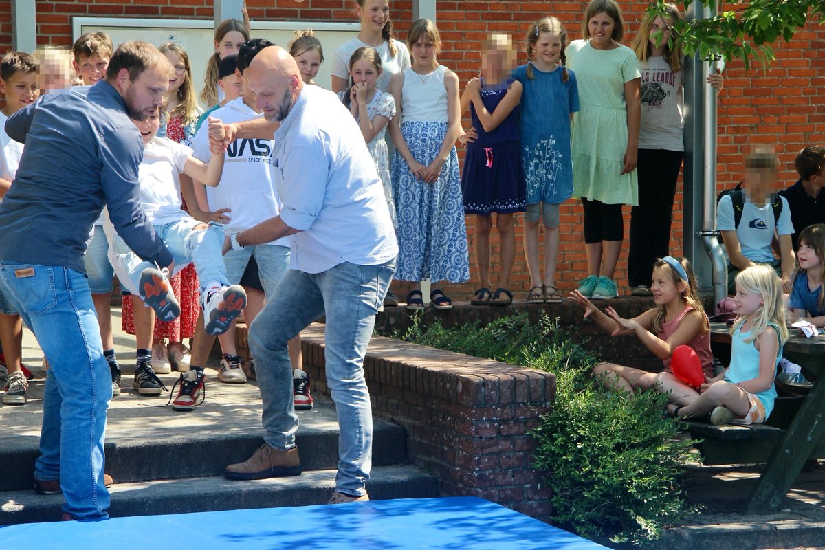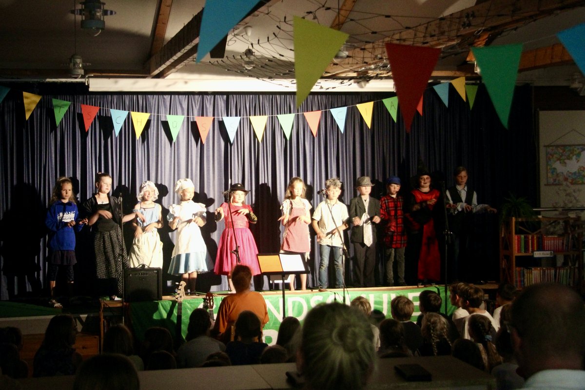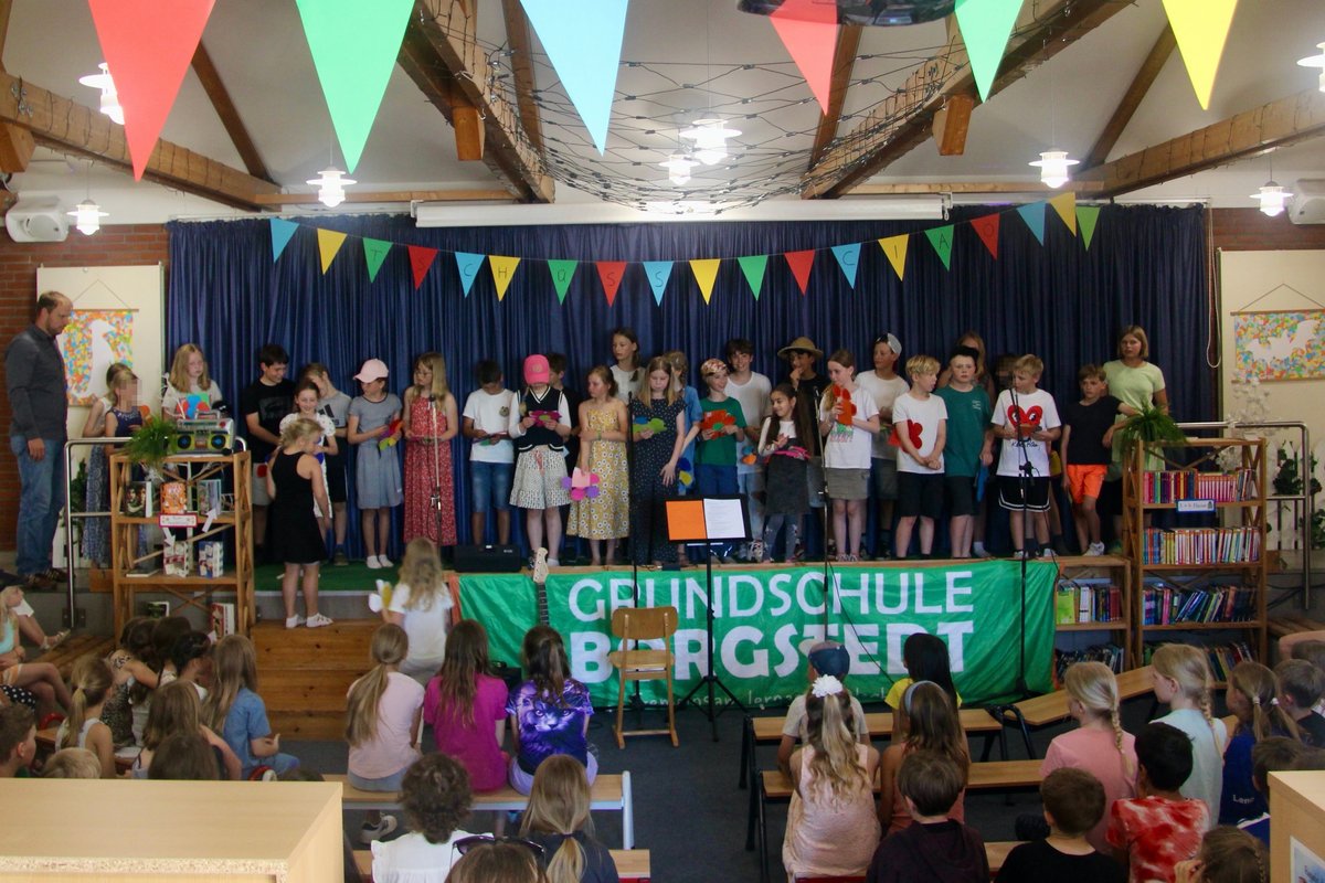 Am Ende der dritten Stunde wurden die übrigen Kinder von ihren Klassenlehrkräften verabschiedet, während die Erdmäuse noch ein wenig nachsitzen mussten. Für sie stand nun die offizielle Verabschiedung auf dem Programm, zu der auch die Familien eingeladen waren. Nach tollen Aufführungen des Chors sowie des Theaterprojekts, einer beeindruckenden Performance des Musikprojekts, verschiedenen schönen Darbietungen der Erdmäuse und persönlichen Worten der Gäste an die Erdmäuse war es dann so weit: Die Erdmäuse wurden in hohem Bogen aus der Schule geworfen!