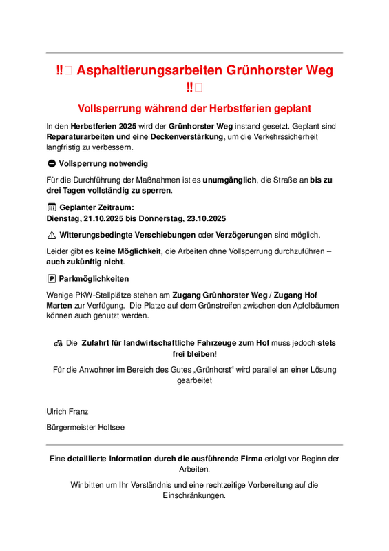 Wegen Instandsetzungsarbeiten wird der Grünhorster Weg vom 21. bis 23. Oktober voll gesperrt. Beachten Sie den Infozettel.