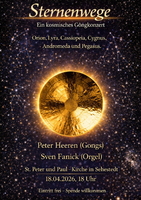 Am Sonnabend, den 18. April um 18 Uhr lädt die Ev.-Luth. Kirchengemeinde Sehestedt zu einem Gongkonzert mit dem Klangkünstler Peter Heeren und als Gast Sven Fanick an der Orgel in die Kirche St. Peter und Paul ein. Das Programm „Sternenwege“ ist ein Zyklus für Gongs, Percussion und Orgel von Moritz N. Jansen. Es bildet sechs Klangbilder zwischen Raum und Zeit.