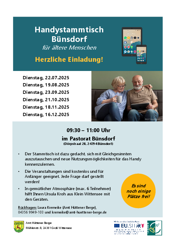 Anmeldung & Rückfragen: Laura Kremeike | Amt Hüttener Berge | 04356 9949-103 | kremeike[at]amt-huettener-berge.de